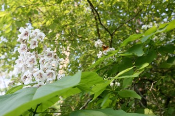 Catalpa speciosa with spangled fritillary butterfly (Speyeria cybele) in the background
